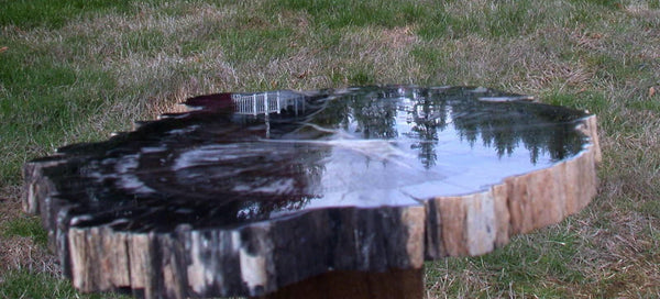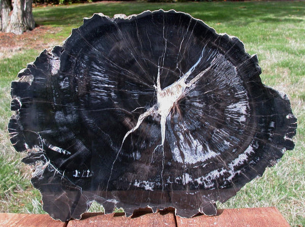 This may be the single most interesting and collectible of all of the magnificent Arizona petrified wood slabs that we've ever offered. The high contrast black with mineral veins is attractive and the shape is very nice, but the real fascination in this piece is the story it has to tell. It comes from an exposure in the vast southwestern US petrified wood deposits from the Chinle Formation dubbed the Black Forest. The name source is somewhat obvious, but less well known is that specimens from the Black Forest were what was first described from the Arizona petrified forests over a century ago that have created one of the better known debates within the scientific community of paleobotanists! I'll share a bit of that story further into the description, but the short version is that I believe this slab is actually from one of the species that was originally described as Araucarioxylon arizonicum by Knowlton in 1889. That detail alone would make this a nice collector specimen, but it turns out that is just the beginning of the story! Due to a combination of procedural errors and failure to discern distinctions between different species, the name A. arizonicum is now considered nomen superfluum by scientists (a problem that gets all the more complicated since it is the legally adopted name of the state fossil of Arizona!) Now, through more recent research, the Black Forest logs are called Pullisilvaxylon. I believe this particular specimen is P. arizonicum due to the intercellular spaces you can see in the microphoto, which kind of makes it the closest thing to the original Knowlton A. arizonicum that exists and is a likely candidate for what the Arizona legislature may or may not get around to renaming one day for the state fossil! If you're a species collector then I'd strongly encourage you to study this specimen and compare it to the 2007 paper by R. Savidge and draw your own conclusions. This is actually the second log I have cut from this site and the distinguishing features in this one are not as easily spotted as they were in the first log so this may well be one of the other species he documents. While the formalized debates are held in hallowed halls, my humble little shop takes pride in knowing this specimen is presented in it's full glory to tell its story to you and all who study it in the future. The mirror finish coaxed from this slightly less silicified wood extends even to the characteristic mineral veins found in most Chinle specimens. It's a fascinating and beautiful specimen sure to be a prized member of any collection!