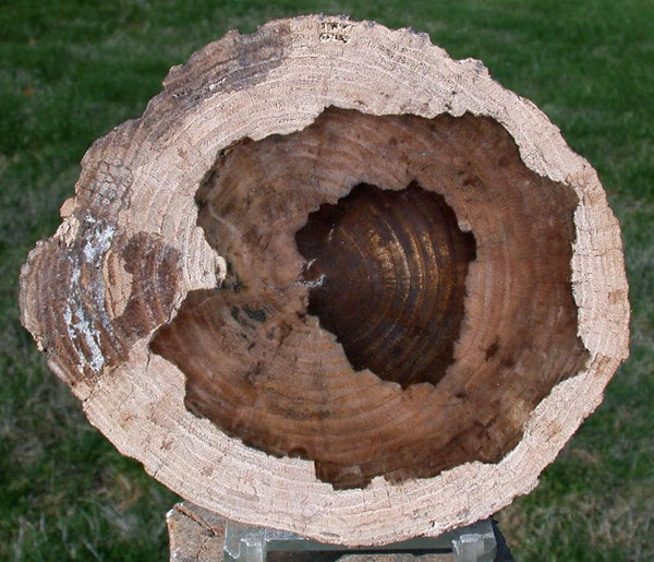 This is a really beautiful specimen of the petrified wood found in a desolate sagebrush desert that spans over 100 square miles on the Oregon/Nevada border. It's a slice from a perfectly preserved hardwood, with absolutely gorgeous gem quality agate in warm, natural wood tones preserving this ancient fossil. The exterior is still ash white - colored by the ancient volcanic blast that buried this prehistoric forest. The inside, however, is a richly colored array of gem quality agate that preserved the wood grain beautifully in every detail! The cell structure from the growth rings in this attractive fossil specimen are amazingly well preserved, especially in the lighter colored regions. You can see confluent structures between the growth rings near the center that have the wavy appearance of elm, but under magnification I actually believe this one is a locust. The rays and the cells in this excellent ring porous hardwood fossil are more consistent with my reference books for locust. The specimens from this particular dig (airport site) are easily recognized by the richer than average color spectrum and the nicely contrasting rind (even by other McDermitt dig standards). what is unusual in this one is the white agate veins in the center. This is 100% natural and not often seen in the McDermitt site - it's very pretty and accents the natural wood colors beautifully.