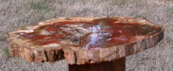 This is a perfect round cut from the center of a nice sized log. This stone has been professionally polished on a special lap that produces a flat face and a mirror perfect shine. It is a perfect slab cut from the center of the log with a fair number of fractures but they've been stabilized so they didn't flake out during finishing - it's a fabulous piece. The polish really is liquid perfect - a difference in the quality products Sticks-in-Stones has built its reputation on!