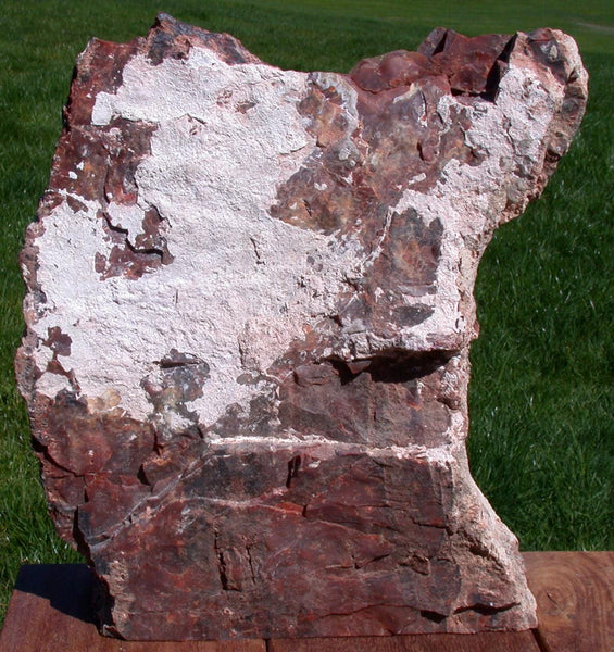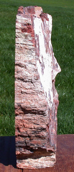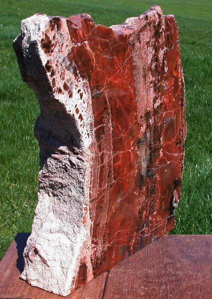 This is a truly beautiful, larger sized log section from one of the most prized petrified wood deposits on the planet! This specimen represents just part of the end of what must have been a truly enormous tree trunk before it became the gem fossil you see now. The color in this one is among the prettiest dark reds that I've cut! This absolutely beautiful piece of gem fossil wood is the end cut from one of the most colorful Arizona rainbow petrified wood logs I've personally handled! It's an extra-large stand-up display specimen cut from a cross section of an enormous log. It was collected by a friend of mine on a private fee ranch in Arizona near the town of Holbrook. It's some of the most colorful wood I've ever seen come from this famous petrified forest. It stands firmly on a cut base as shown in the photo and the face is polished to a mirror finish as only we promise on every piece we offer. The back and sides are rough and natural, just as they came from the ground and the entire stone is substantial and thick. This giant sculpture is approaching the limits of what I can produce in my shop - you won't find many like this anywhere in the world! It has a very impressive presence that would look amazing as a mantel piece, on a bookshelf or even a desk or table!