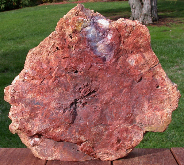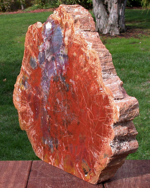 The color in this massive mantel piece is so brilliant that my camera struggled not to meltdown in the direct sunlight with all of those bold oranges, blues, purples, yellows and reds! This absolutely massive and beautiful piece of gem fossil wood is cut from the end of one of the most colorful Arizona rainbow petrified wood logs I've personally handled! It's an extra large stand-up display specimen cut from a full cross section of an enormous log. It was collected by a friend of mine on a private fee ranch in Arizona near the town of Holbrook. It's some of the most colorful wood I've ever seen come from this famous petrified forest. It stands firmly on a cut base as shown in the photo and the face is polished to a mirror finish as only we promise on every piece we offer. The sides and back are rough and natural while the base is cut smooth and flat. The display face is polished to a mirror finish to reveal the magnificent color of this 200 million year old fossil gemstone! This giant sculpture is approaching the limits of what I can produce in my shop - you won't find many like this anywhere in the world! It has a very impressive presence that would look amazing as a mantel piece, on a bookshelf or even a desk or table!