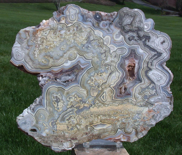 This gorgeous piece of Crazy Lace agate has patterns in it that were formed in a seam that sometimes "pinched off" to produce nodules. These nodules form more classic fortification agate patterns than the long famed Crazy Lace was typically known for. It's still a very "confused" arrangement of agate bands which is how the stone earned its name, but it's unmatched in beauty and detail! The colors in this new deposit are centered mostly in very, very finely detailed grays, whites and yellows, but you can find plenty of other colors packed within the bands of the best pieces! There is a fantastic display of subtly colored agate bands in this stone that the camera (and your 256 color browser window) simply can't do justice to. There are bands, and rings and plumes and eyes and crystals and little intricate lacy patterns throughout this beautiful stone. This one demonstrates exactly how the stone earned it's name, displaying a pattern that shows off the best of what this Northern Mexico native has to offer. It's a very beautiful stone and I guarantee you'll be amazed how nice it is compared to the photo, particularly once you see our trademark mirror polish in this remarkable stone!