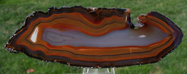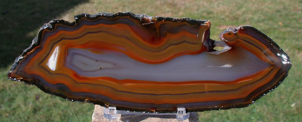 This agate is fairly large and represents a classic blackskin from the Piranha site. It measures about 7" x 2 3/8" on the polished face, is cut about 1/2" thick and weighs 0.58 lbs.
