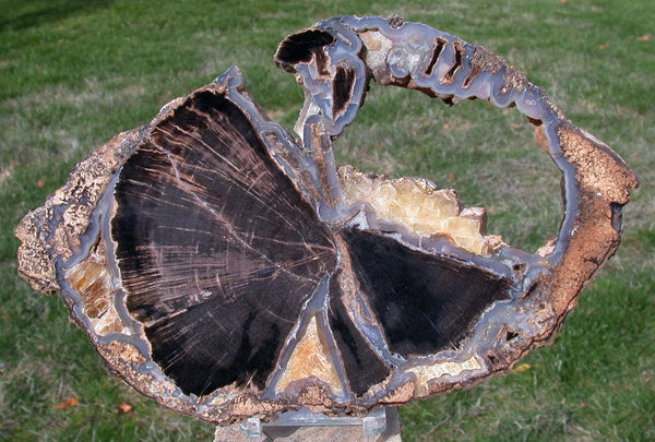 This is one of the largest and definitely one of the most eye catching Blue Forest rounds we've ever offered! The cut in this slab intersected a very large cavity framed in botryoidal blue agate and partially filled with yellow calcite crystals. It's cut from one of the most detailed, richly colored logs we've ever had the pleasure of handling! Logs rarely reach this diameter in this particular forest, and to see such an incredible display of color and fossil wood grain is just a treat for your eyes as much as for your imagination! This famous petrified forest gives up very few large logs and fewer still in this kind of flawless condition! There is a lot of the characteristic blue agate framing this specimen and filling the desiccation voids that made this petrified forest famous. This one features gorgeous yellow calcite crystal formations filling some of the agate voids and some nice insect borings as well! The pattern in this fossil is one of the most visually striking specimens I've ever seen come from this amazing valley! Polished to perfection, it's definitely one of the best Wyoming petrified wood fossil finds you'll find!!