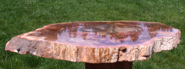 This is a complete round cut from the center of a nice sized log. It shows the distinct (and uncommon to see so well in logs from this location) honeycomb grain structure of modern conifers (no resin canals visible) which makes it related to modern fir and sequoia (it's probably Araucaria). This stone has been professionally polished on our own custom built lap that produces a flat face and a mirror perfect shine. It is a full slab cut from the center of the log. The polish really is liquid perfect - a difference in the quality products Sticks-in-Stones has built its reputation on!