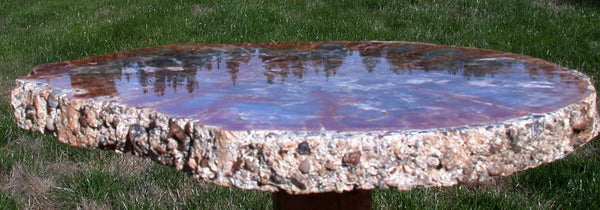 I was fortunate enough to obtain some really nice Arizona petrified logs that are usually hard to come by this far north. I do manage to stumble into a choice piece every now and then and this stunning specimen certainly is one of the prettiest larger sized rounds I've handled in recent years. The stone log was pricey, but it had such dramatic colors in a nice displayable size that I couldn't pass it up! This log produced some of the finest and visually captivating Arizona Rainbow specimens you'll find with truly remarkable natural color. It's the kind of specimen that explains how this wood earned its name! It really looks like a rainbow went through a galactic explosion to produce this unimaginable color! The log is very nicely agatized and took a magnificent polish in our world class lapidary shop to bring all of that amazing color to life as only the best grades of petrified wood can. Much of the rind still features the river gravel sediments that were entombed along with the log and fused into a single stone over 200 million years of time and pressure below ground. This looks to be an Araucaria (an ancient conifer). The deep reddish orange, blue gray and white agate combine with the ancient wood grain to make a stunning display piece! This thick, solid slab is also an excellent candidate for a unique end table top. We don't offer it often - but when we do you know it's a great piece!! I don't often get top grade examples of petrified wood from Arizona and what I do see is usually table top size and not very easy for a collector to display. This particular log is an exception to both rules. I didn't find it, but I sure wish I had! It's one of the better preserved medium sized petrified wood logs I've seen from that state and deserves a place in your collection as well. Most of the petrified logs found in this particular area are Araucaria, and the structure in this one is consistent with those. The cell structure of most of these super old conifer like trees are very difficult to separate just in cross section no matter how well defined they are and this one is no exception. If you're new to our shop the one thing you should expect is to see an unexpectedly glossy finish on each stone we prepare. This complete round is a wonderful example of the best lapidary work you'll find. It's been cut with a diamond saw and flat lapped on equipment I built myself to produce a mirror perfect polish unmatched by any of our many would-be imitators. The detail captured and revealed through the highly polished surface is just immaculate. It's easily some of the best fossil wood to be found anywhere! The rings are gorgeous, the agate is highly polished and the detail is easier to see in person than the photo suggests. It's a truly special find and we won't likely have a lot more so get a piece for your collection while it's available!This is a choice slab from the center of the log. It measures about 18" x 14 5/8" as it sits in the photo. It is cut about 1.16" thick. Weight is 24.12 lbs.