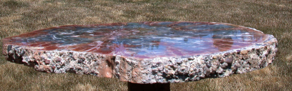 I was fortunate enough to obtain some really nice Arizona petrified logs that are usually hard to come by this far north. I do manage to stumble into a choice piece every now and then and this stunning specimen certainly is one of the prettiest larger sized rounds I've handled in recent years. The stone log was pricey, but it had such dramatic colors in a nice displayable size that I couldn't pass it up! This log produced some of the finest and visually captivating Arizona Rainbow specimens you'll find with truly remarkable natural color. It's the kind of specimen that explains how this wood earned its name! It really looks like a rainbow went through a galactic explosion to produce this unimaginable color! The log is very nicely agatized and took a magnificent polish in our world class lapidary shop to bring all of that amazing color to life as only the best grades of petrified wood can. Much of the rind still features the river gravel sediments that were entombed along with the log and fused into a single stone over 200 million years of time and pressure below ground. This looks to be an Araucaria (an ancient conifer). The deep reddish orange, blue gray and white agate combine with the ancient wood grain to make a stunning display piece! This thick, solid slab is also an excellent candidate for a unique end table top. We don't offer it often - but when we do you know it's a great piece!! I don't often get top grade examples of petrified wood from Arizona and what I do see is usually table top size and not very easy for a collector to display. This particular log is an exception to both rules. I didn't find it, but I sure wish I had! It's one of the better preserved medium sized petrified wood logs I've seen from that state and deserves a place in your collection as well. Most of the petrified logs found in this particular area are Araucaria, and the structure in this one is consistent with those. The cell structure of most of these super old conifer like trees are very difficult to separate just in cross section no matter how well defined they are and this one is no exception. If you're new to our shop the one thing you should expect is to see an unexpectedly glossy finish on each stone we prepare. This complete round is a wonderful example of the best lapidary work you'll find. It's been cut with a diamond saw and flat lapped on equipment I built myself to produce a mirror perfect polish unmatched by any of our many would-be imitators. The detail captured and revealed through the highly polished surface is just immaculate. It's easily some of the best fossil wood to be found anywhere! The rings are gorgeous, the agate is highly polished and the detail is easier to see in person than the photo suggests. It's a truly special find and we won't likely have a lot more so get a piece for your collection while it's available!This is a choice slab from the center of the log. It measures about 18 3/4" x 14 3/4" as it sits in the photo. It is cut about 1.17" thick. Weight is 24.3 lbs.