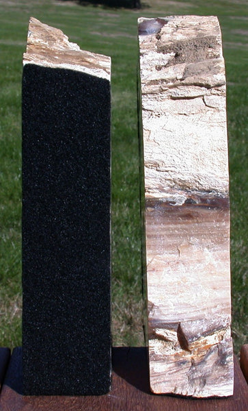 This gorgeous set of bookends is one of the most dramatic, interesting and glassy larger sized sets we have cut from this type of petrified wood. It represents one of the most perfectly fossilized and most uniquely colored Washington State petrified wood logs we've come across in quite some time. This fossil wood turned stone comes from the Saddle Mountain area in Central Washington. It's a beautiful specimen with great growth rings and finely detailed wood structure under magnification in pleasing naturally warm colors. This one is from what appears to be a relative of modern bald cypress trees and the contorted, kinky edge of the log is fairly typical of how these giant trunks formed, as are the natural voids and hollows that were in the original log before it petrified. Each one unique and fascinating and capable of producing a true work of natural art! The wood structure is intricately preserved and easily studied with the naked eye and even magnification to reveal fine growth detail. The mirror polish is world class and really brings this stone to life. It's definitely one of the most unique and artful Saddle Mtn. specimens you're likely to encounter, all cut into a perfectly matched and beautifully functional set of bookends! This is a really gemmy set of bookends cut from the center of a nice, larger sized petrified log that came from our neighboring state. Washington has a few nice petrified wood deposits clustered around the volcanic reaches of the Cascades, the most well known of which is Saddle Mountain. The Saddle Mountain wood is usually sort of a cross between what you'll find on the McDonald Ranch and McDermitt here in Oregon with colors centered in browns and creams. Many of the specimens recovered there have a really high opal content like the McDonald Ranch wood does. The opal content makes it a bit more challenging to get a good polish on, but this stone really shined up beautifully to produce a wet looking, mirror finish. The growth rings are really well preserved in this one and it is clearly sequoia. With a hand lens you can make out the conifer cell structure pretty easily. It's particularly nice agate and the polish shows off the natural gemmy beauty very nicely! We select only the showiest pieces of petrified wood and other gemstones to cut into bookends. These pieces are carefully cut in our shop so that you end up with a perfectly matched pair, one agate piece is the mirror image of the other. Of course, there are plenty of differences in the two halves, but the photo should let you appreciate how well we do this. The bookends sit perfectly upright and are completely square to one another. They are felted on both the sides and bottom to protect the books and the shelf. We make sure they are 100% functional on top of being beautiful! Of course, these agates proudly show the perfect polish that the Sticks-in-Stones rockshop has dedicated itself to. The finish looks poured on - but there's nothing there except rock!! This is the only set of bookends we have cut from this location so don't miss this fabulous natural treasure! Each half measures about 7 7/8" tall & 5" wide at the widest spot on the polished face. They're cut about 1 3/4" thick. Weight for this set is about 9.64 lbs. which makes these bookends suitable for just about any sized book you have including the typical sized text book, reference books or cookbooks. What better way to accentuate a bookshelf or your mantle than with this unbelievable natural work of art! A nice, unique naturally wonderful stone collectible exclusively from Sticks-in-Stones Lapidary.