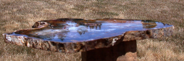 Here's an absolutely gorgeous, hard to come by petrified wood round from one of the most prized petrified wood deposits ever discovered! If you aren't familiar with the Hubbard Basin petrified wood from Nevada, you should be! It's a very colorful variety, though not plentiful so the pieces aren't often found (or seen). This piece has all of the best colors that these coveted specimens are famous for. The characteristic blue, white and gold along with a lot of other colors appear to have been painted into the stone with the single intention of drawing a gasp from the fossil wood collector on sight! Besides being beautifully colored, it's also perfectly preserved. The flowing wood grain from this complete round starts at the heart and fans out through every part of this highly colorful wood. Hubbard Basin petrified wood is highly prized among fossil and gemstone collectors because of it's uniquely beautiful blue color and gold, red, etc. inclusions. It's also some of the best agatized wood to be found and is sometimes even translucent. This piece appears to be from a conifer and the cell structure is visible in several areas. Most (but not all) of the specimens found in this lost forest are petrified spruce. This is a larger log cross section of petrified wood. This round is complete, and nicely sized although most of these specimens were from softer wood species and like their cousins in Cherry Creek (Nevada's other famous deposit) they tended to get "squashed" in the ground typically forming distorted rounds when cut. If you haven't seen our petrified wood specimens before then you've been missing one of the best treasures found on eBay! We work hard to find the best specimens from the most prized locations and then work with our magic to create a world class specimen for your collection. The piece is quite solid and meant to be handled. A quick squirt of windex will remove fingerprints from the glassy, mirror polished surface. This stone has been professionally polished on a special lap that produces a flat face and a mirror perfect shine. We obtained this round at a local show a couple of years ago and reworked the commercial finish to produce a world class specimen featuring the Sticks-in-Stones polish worthy of a place in your own collection. The polish really is liquid perfect - a difference in the quality products Sticks-in-Stones has built its reputation on! It measures about 9 1/2" x 7 3/8" wide on the polished face. It is cut about 0.52" thick. Weight is 2.18 lbs. Sticks-in-Stones Lapidary is happily providing UPS shipping to greatly reduce shipping charges on large rock orders. We will combine auction items or provide additional items from our shop to bring you the greatest possible value in fine Lapidary & stone collectibles!