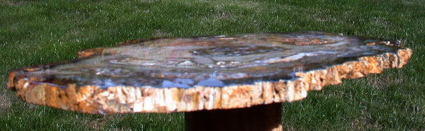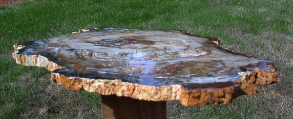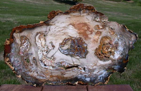 NOTE: The last photo is taken from a mate cut slab off of the same log. It's included to help show edge detail and finish quality which are both virtually identical in this slab but difficult to capture well in a photo. Here's an absolutely gorgeous, virtually flawless petrified wood round from one of the most prized petrified wood deposits ever discovered! If you aren't familiar with the Hubbard Basin petrified wood from Nevada, you should be! It's a very colorful variety, though true collectible pieces from this location are not plentiful. This piece has all of the best colors that these coveted specimens are famous for. The characteristic blue, white, red, black and gold along with a lot of other colors appear to have been painted into the stone with the single intention of drawing a gasp from the fossil wood collector on sight! Besides being beautifully colored, it's also perfectly preserved. The flowing wood grain from this complete round starts at the heart and forms massive arcs through every region of this highly colorful wood. The cells are uncommonly well preserved for Hubbard Basin wood with virtually every colorful region showing excellent wood grain preservation right down to the ray cells within the growth rings! The detail in the lighter regions is washed out in the photo, but it's easily visible in the actual stone. Hubbard Basin petrified wood is highly prized among fossil and gemstone collectors because of it's uniquely beautiful blue color and gold, red, etc. inclusions. It's also some of the best agatized wood to be found and is sometimes even translucent. Wood is relatively scarce from this region and true collector pieces are very seldom encountered. The qualities that make a piece valuable are color, completeness, shape and fracture free - this piece has them all and several dozen open crystal cavities to boot! This is an extra large log cross section of petrified wood. This round is complete, and nicely sized although most of these specimens were from softer wood species and like their cousins in Cherry Creek (Nevada's other famous deposit) they tended to get "squashed" in the ground forming oblong rounds when cut. This log was one of the rare exceptions to that rule, having maintained it's original shape. This one is a conifer of some variety (probably spruce). If you haven't seen our petrified wood specimens before then you've been missing one of the best treasures found on eBay! We work hard to find the best specimens from the most prized locations and then work with our magic to create a world class specimen for your collection. Our shop is unmatched in both the techniques and attention to detail to produce the finest petrified wood specimens available anywhere. Our work stands above that of the commercial vendors simply because we take the time to make each piece something we'd keep in our own collections which means you'll be treated to a lustrous polish that still looks wet to the touch when you see this true collector gem! The piece is quite solid and meant to be handled. A quick squirt of windex will remove fingerprints from the glassy polished surface. This stone has been professionally cut and polished on a special lap that produces a flat face and a mirror perfect shine. The polish really is liquid perfect - a difference in the quality products Sticks-in-Stones has built its reputation on that others can only aspire to! It measures about 16 7/8" wide and about 10" tall on the polished face. It's cut about 0.53" thick. Weight is about 5.42 lbs. Sticks-in-Stones Lapidary is happily providing UPS & USPS shipping to greatly reduce shipping charges on large rock orders. We will combine auction items or provide additional items from our shop to bring you the greatest possible value in fine Lapidary & stone collectibles!