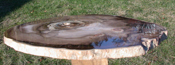 This virtually perfect, larger sized petrified wood round measures about 12 5/8" x 11" wide at the widest point across the mirror polished face and is cut approx. 0.54" thick. Weight is 5.18 lbs.